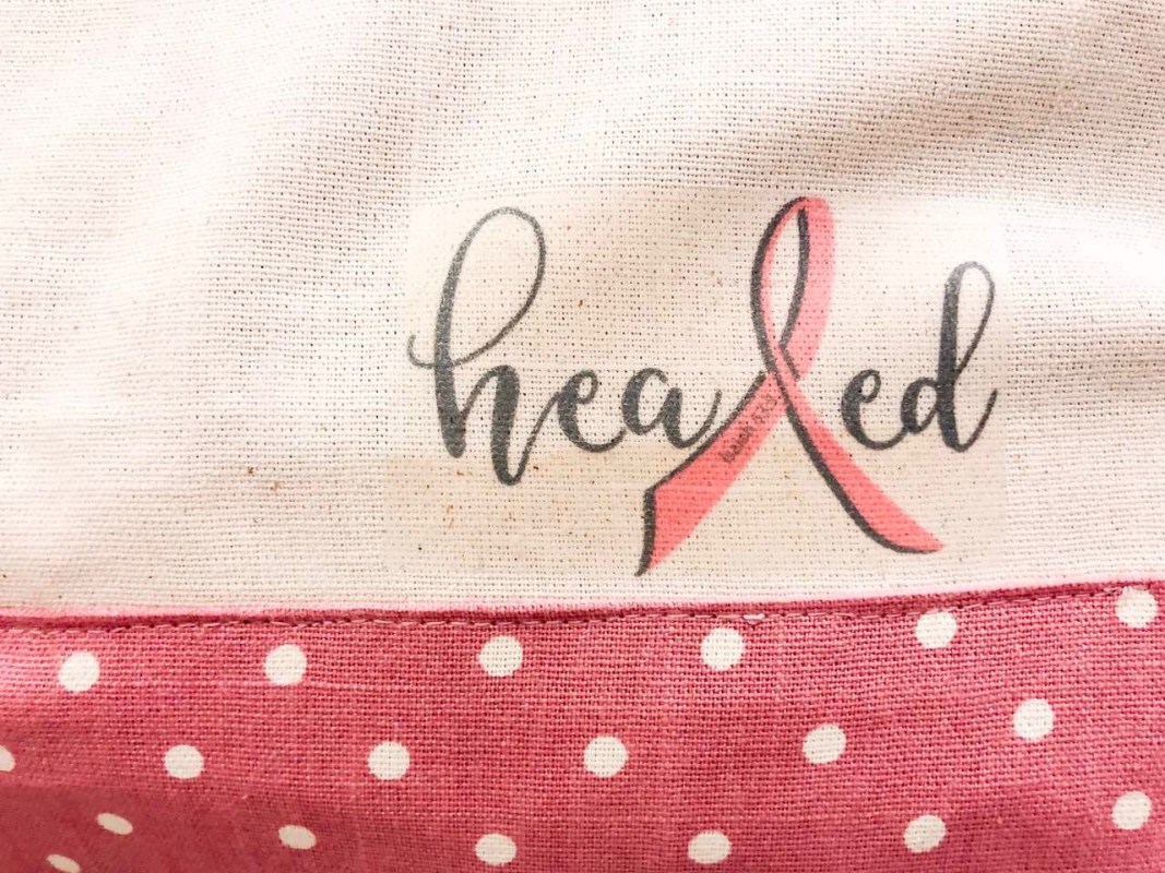 I made a reversible tote bag for her and asked Sidney to design the word “healed” with L in the shape of pink ribbon. We printed it on iron-on transfer paper and ironed it on one side of the tote bag.