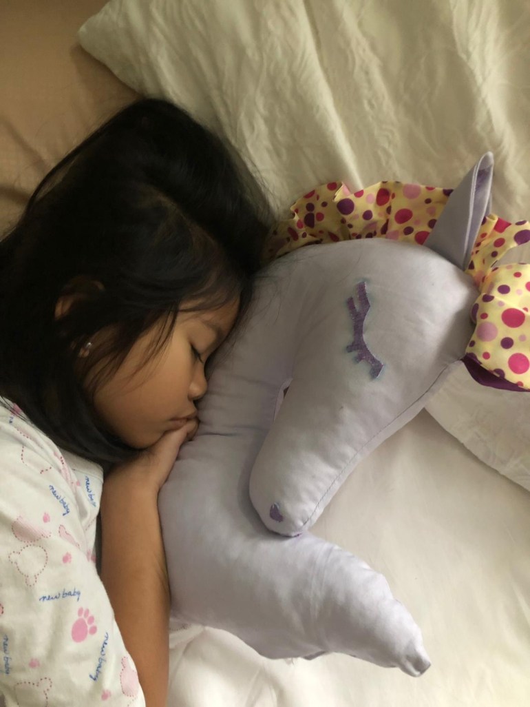 I used fabric scraps – light purple cotton for the body, yellow polka dot cotton for the mane and fringe, purple polyester for the eyelashes and inner ear, and dark purple satin for the horn. I couldn’t decide what to do with the eyelashes and nose at first – this was the step I was most wary about. In the end, I interfaced the polyester to prevent fraying, then used Heat n Bond iron-on adhesive. The eyelashes still frayed a little, and I forgot to wipe off the fabric marker, at the eye area, but Lia loved it and hugged it to sleep that night.