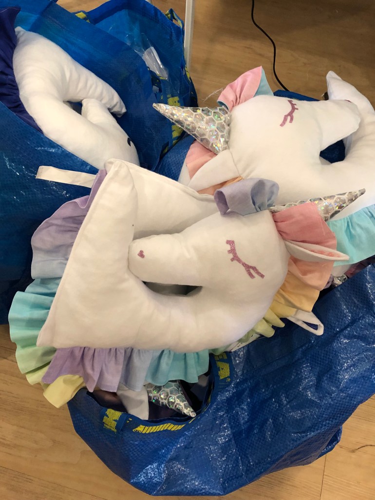 Afterwards, I packed all the unicorn and horse pillows with each kid’s name on a safety pin, and went to school with her unicorn cupcakes and 3 bags of stuffing.