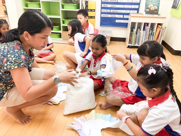 Lia had a lot of fun teaching her classmates how to stuff the pillows properly. And the kids had a lot of fun and kept asking me if they could bring home the pillows after. One boy had a bit too much fun with the stuffing and grabbed a handful and threw it to the air, pretending it was snow. He wasn’t too happy when the teacher made him pick it up after.