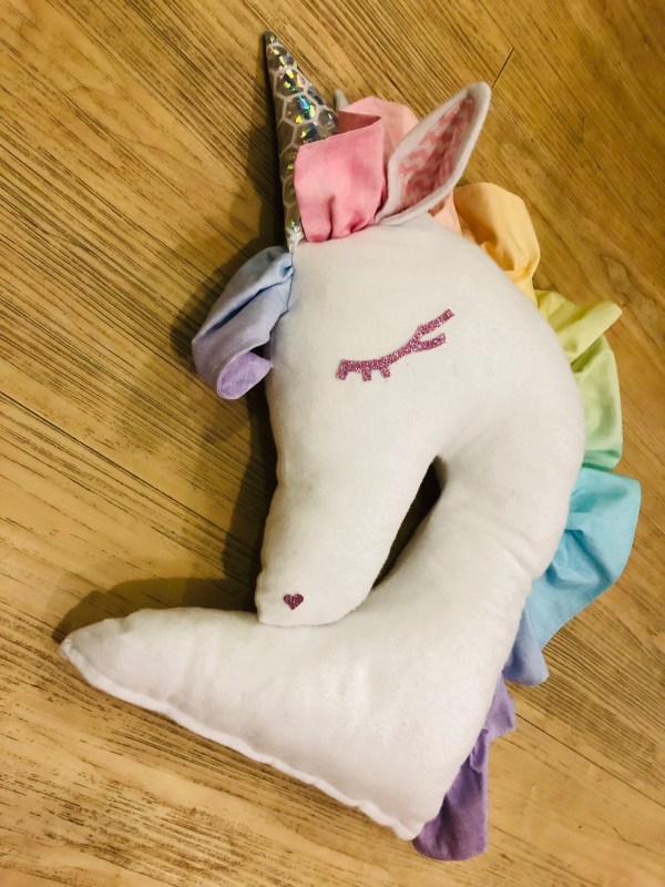I had to quickly source the materials for the 16 pillows in one week and coordinate with her teacher. I really liked a pillow someone posted on Facebook so I reached out to her and asked for tips. I copied what she used for the body (white flannel to make it very cuddly) and pastel ombre fabric from Timeless Treasures for the mane.