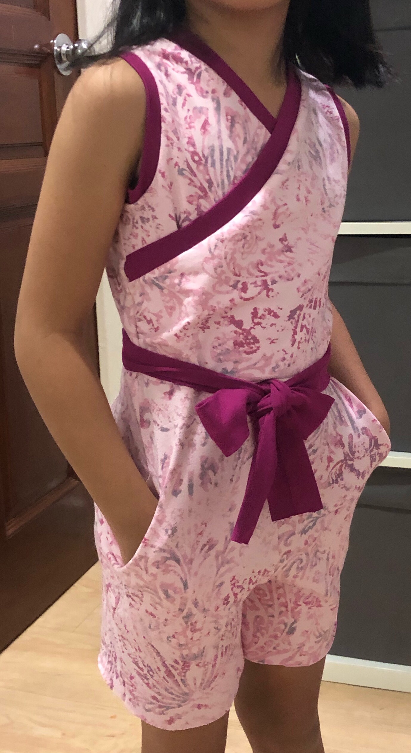For the testing, I dug it out from my heap of unfinished projects and with some pattern tetris, I was able to get all the pattern pieces out of it except for the neckband and sash. For that I used purple bamboo lycra remnants from a dress I made months ago. For the pockets I used pink scuba knit remnants which was a mistake because it’s heavier than the cotton jersey I’m using.